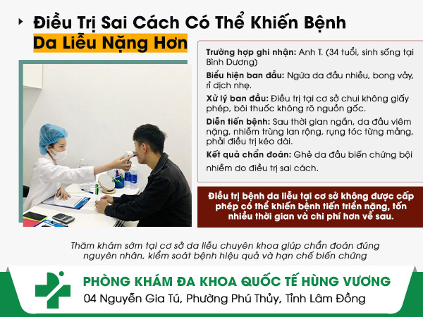 Không ít người tại Bình Dương khi gặp các vấn đề ngứa da đầu, bong vảy, rỉ dịch thường chọn điều trị nhanh tại những cơ sở nhỏ lẻ gần nhà mà bỏ qua yếu tố pháp lý và chuyên môn. Chính sự chủ quan này có thể khiến bệnh nhẹ ban đầu tiến triển nặng, để lại hậu quả khó lường. Trường hợp dưới đây là một ví dụ đáng suy ngẫm.