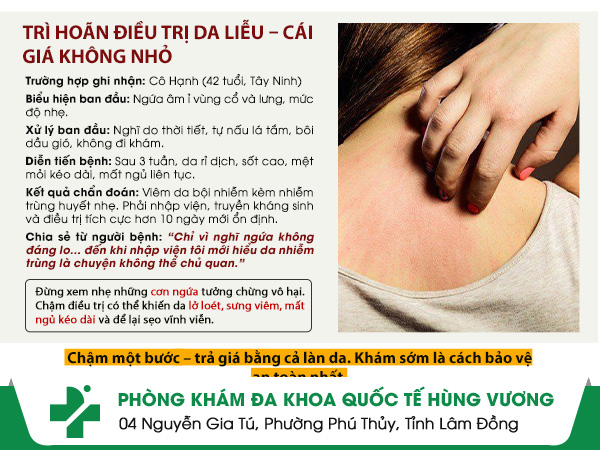 Chỉ từ những cơn ngứa âm ỉ tưởng như vô hại, cô Hạnh đã chọn cách chịu đựng và tự xử lý tại nhà. Thế nhưng, sự chủ quan kéo dài từng ngày đã âm thầm đẩy làn da vào tình trạng nhiễm trùng nặng, buộc cô phải nhập viện trong mệt mỏi và lo lắng — khi cái giá phải trả không chỉ là thời gian, mà còn là sức khỏe và làn da của chính mình.