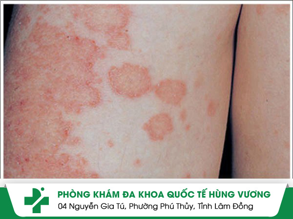 Mặt trong đùi xuất hiện các mảng đỏ sẫm có hình đồng xu với đường viền sậm màu hơn mảng da bên trong.