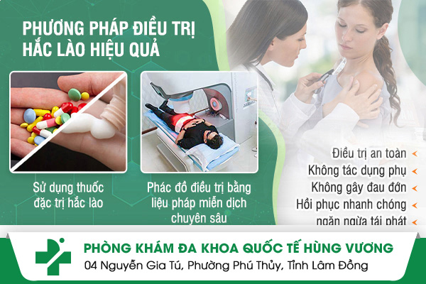 Phòng Khám Da Liễu Hùng Vương tọa lạc tại 4 Nguyễn Gia Tú, P. Phú Thuỷ, Tỉnh Lâm Đồng hiện đang là một trong số ít phòng khám chuyên điều trị hắc lào tại TPHCM uy tín. Người bệnh đến khám chữa bệnh tại đây không chỉ hài lòng về kết quả điều trị mà còn hài lòng cả về những dịch vụ mà phòng khám mang lại.